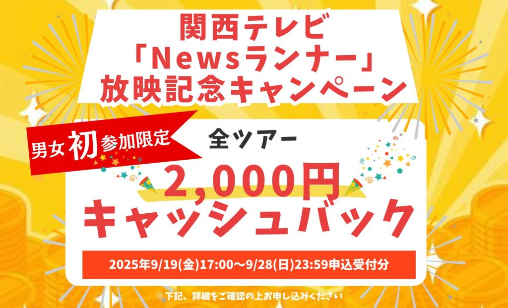 - 注意事項 :2回目以降のご参加の方はキャンペーンの対象とはなりません。また、ツアー参加時に、身分証明書の確認をさせて頂きます。お申込み時に「お名前」「生年月日」は正しくご入力をお願い致します。当日に、「お名前」「生年月日」が予約情報と相違がある場合はキャンペーン対象外となります。ご注意ください。