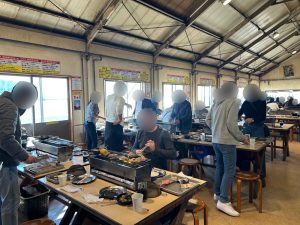 本日は男性17名、女性15名の計32名で出発です。 車内でトークタイムをし全員と顔見知りになって頂き、まずは薪火と発酵のレストラン「Femy_」にて昼食です。 薪窯焼きのメイン料理と頂鱒のお造り、野菜たっぷり楽しめるコースを堪能しました。