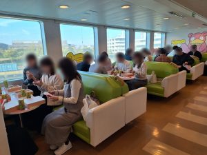 本日は婚活にこだわらない男女の交流を楽しむハピ旅企画です! 男性11名様、女性11名様の合計22名様のご参加です。 梅田を出発し姫路港に向かいフェリーにご乗船頂き小豆島に向かいました。本日は船内にて秋の味覚満載のお弁当をお召し上がり頂きました。