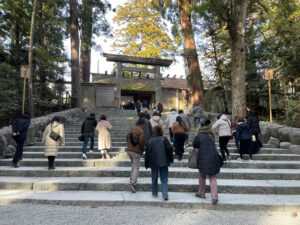 本日は男性8名様、女性9名様の合計17名様が婚活ツアーにご参加くださいました。バスに乗車していただきトークタイムを楽しんでいただきながら伊勢に向かいました。 寒波到来で三重県に入った辺りから雪景色になりました。まずは夫婦岩と興玉神社の参拝です。興玉神社に参拝されたり夫婦岩の写真を撮られたりとグループで思い思いに過ごしていただきました。