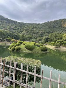 10月25日 土曜日 男性13名 女性15名の28名で梅田から出発しました。 まず向かうのは 特別名勝 栗林公園です。 今回の行きの道中は移動時間が長いので15分と少し長めにトークをして頂きました。 ちょうど、栗林公園到着時に皆様とお話して頂けた状態でした。 到着後Bコースのお客様は吹上亭で本場讃岐うどんをはじめ讃岐の郷土料理をお召し上がり頂いてからAコースと合流し、案内人の方の説明を聞きながら園内を鑑賞しました。