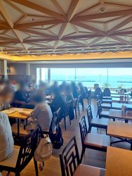 最後はオーシャンテラスでの夕日を見ながらの夕食です!お気に入りの方に声をかけていただきご自由にお座りいただきました。ジャズえを聞きながらゆたりした時間がながれて、夕日もきれいで心地よい潮風もあり和気あいあいと話もはずまれたようです。