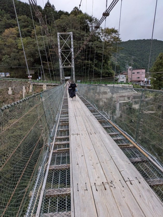 十津川に架かる、長さ297.7㍍、高さ54㍍の谷瀬の吊り橋を男性陣から挑戦!朝からの雨も止み、快晴の中足元に注意しながら、渡って頂きました。