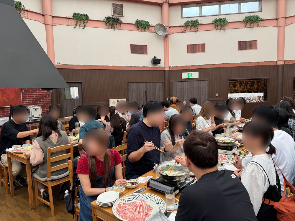 まずとんとん広場へ向かいしゃぶしゃぶ鍋を食べました。しゃぶしゃぶ以外にも、名産豚のソーセージや生ハムサラダなどを追加で注文してみんなでシェアして食べている様子もあり、楽しい雰囲気でした。