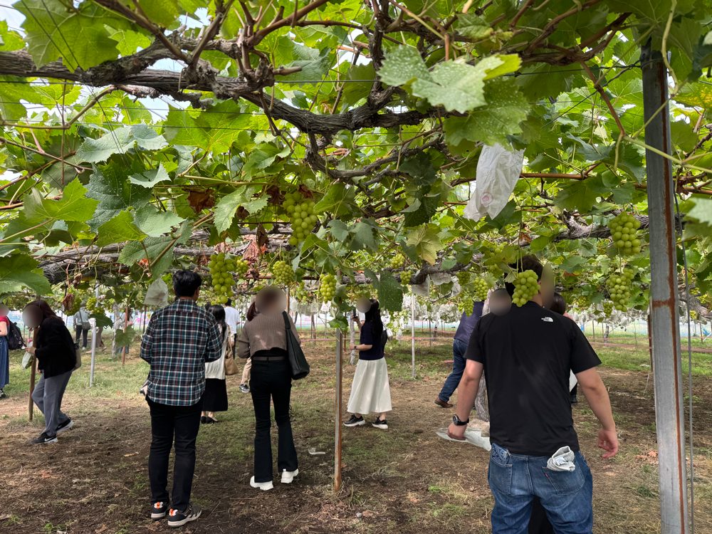 その後原田農園に行き、シャインマスカット狩りをしました。スタッフの方においしいシャインマスカットの見分け方を教えてもらい、一房持ち帰りました。試食でいただいたシャインマスカットもとてもおいしくて好評でした。