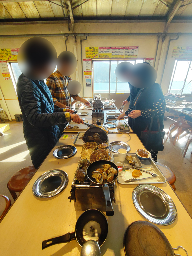 4名1組のテーブルでは、サザエ・ホタテ・牡蠣などを豪快に焼き上げていきました。