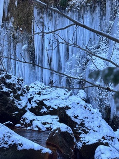 たどり着いた屏風岩は、名前の通り堂々とした迫力。厳しい寒さで凍った水の流れが大きな氷柱の塊となって目の前に静かに広がっています。岩肌に冬の景色が重なると、空気までキリッと引き締まって見えて、「来てよかった…」という声があちこちからこぼれました。静かな感動のあとに、なぜか笑いも出てくるのが不思議で、雪道を一緒に越えた達成感が、みんなの表情を明るくしていました。