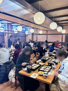 昼食は、日本酒のミュージアムも兼ねている「遊楽庵」さん。圧巻の日本酒の瓶の展示に迎えられた後、蕎麦御膳を堪能。暖かい鴨鍋とキリッとしまった10割そばを召し上がりながら「冬の蕎麦って、なんでこんなにおいしいんろう」「この後雪道ってどのくらいかな?」なんて期待を膨らませたり。食事の時間が、旅の仲間をつくる時間にもなっていました。