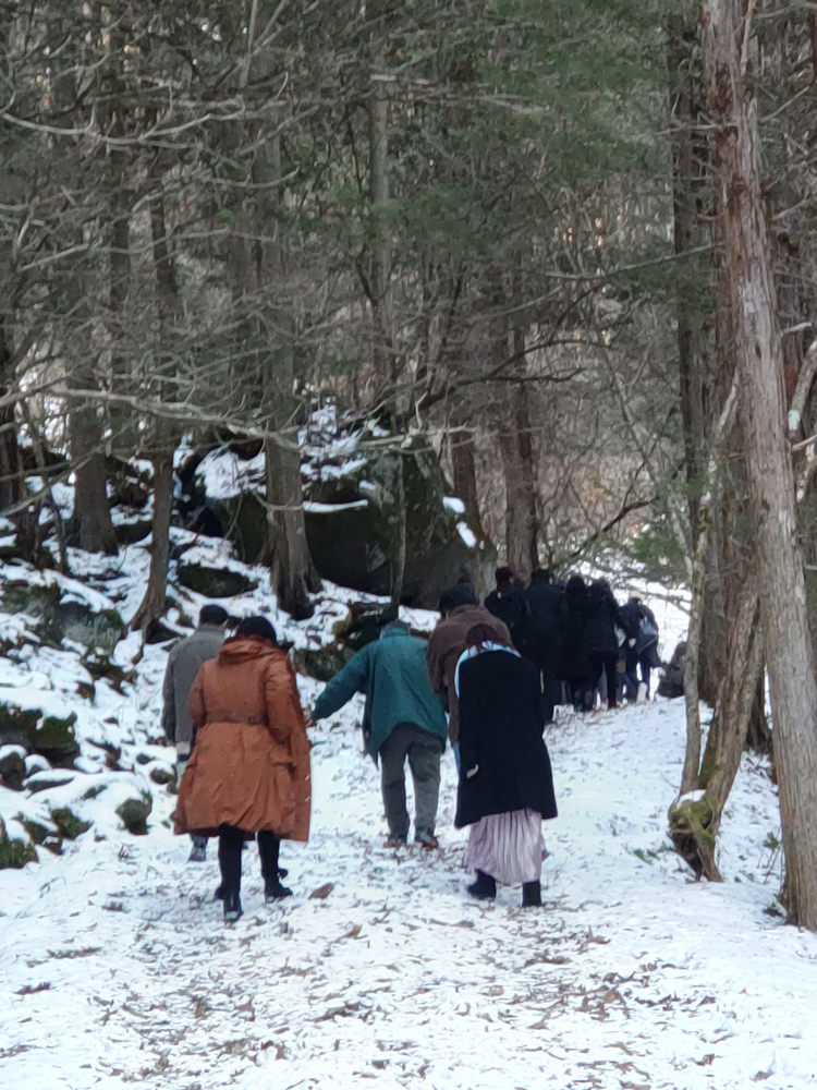 実は事前アンケートでは期待度が低かった場所なのですが(笑)、実際に屏風岩の巨大な氷柱を目の当たりにすると、「今日一番の感動!」「来てよかった!」と歓喜の声が上がりました。滑りやすい雪道をお互いに気遣い、声を掛け合うなかで、自然と皆様の距離がグッと縮まっていくのが印象的でした。