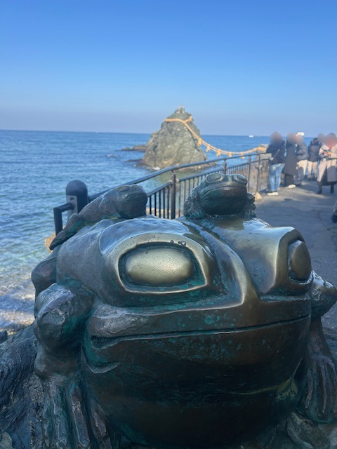 青い海を背景に並び立つ夫婦岩を前に、これから始まるご縁を願いながら二見興玉神社を参拝します。