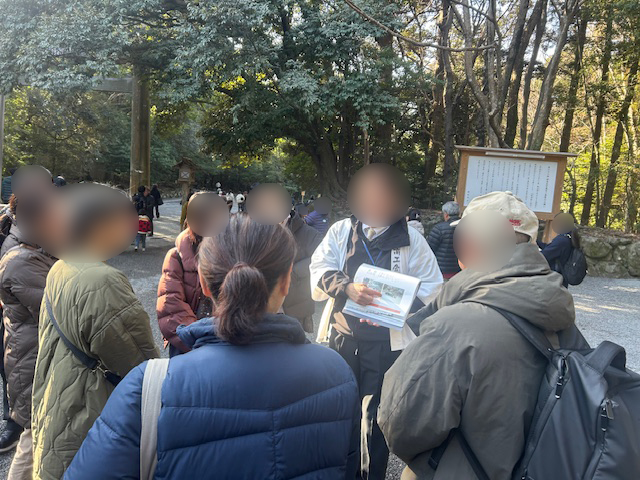その後、2グループに分かれ、お伊勢さん観光案内人の方と一緒に伊勢神宮 内宮を約90分かけて参拝します。