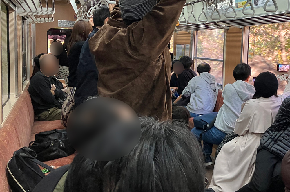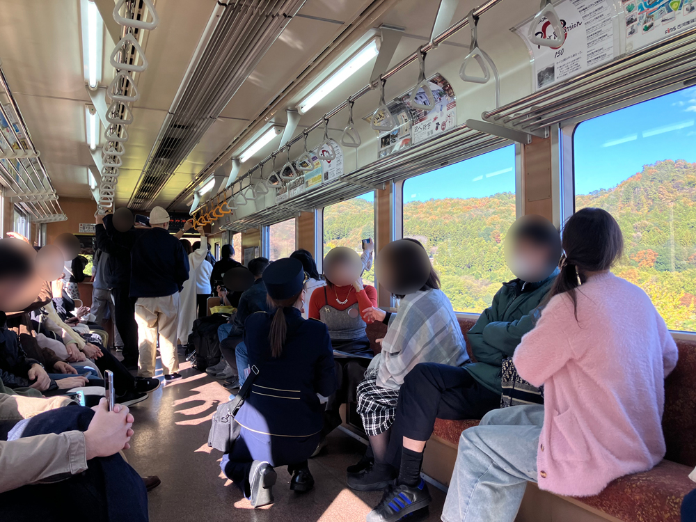 ローカル鉄道の車窓から見える青空と紅葉の景色を眺めながら、参加者はゆったりと会話を楽しんでいました。