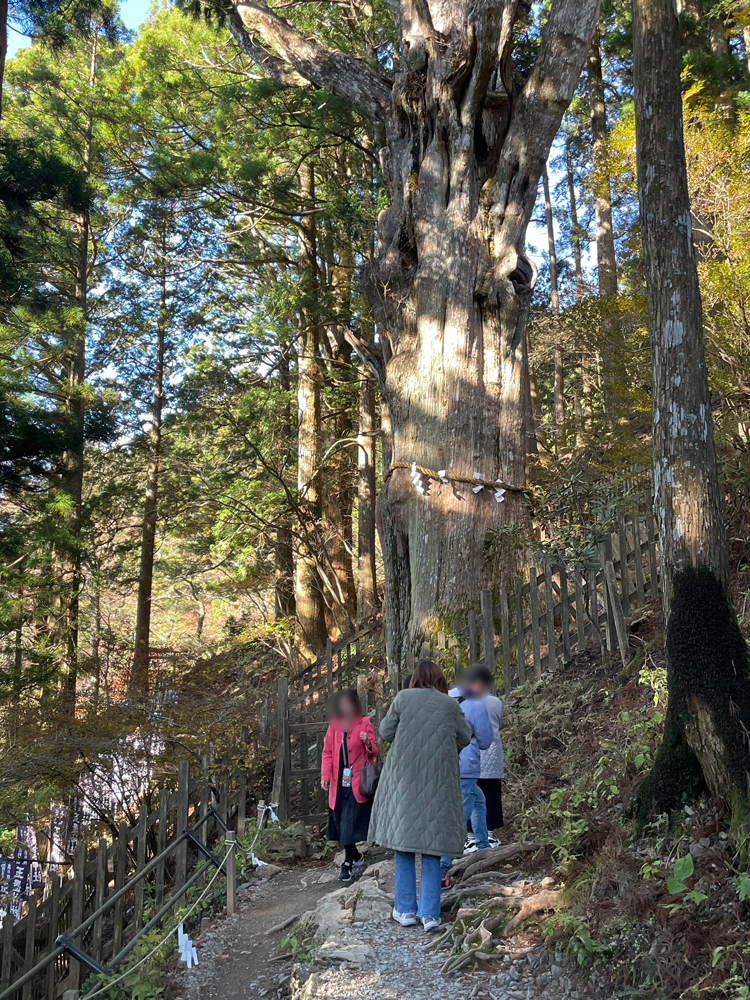 本殿から参拝いただき、樹齢3000年近くある夫婦杉や神代杉などもお参りして、山道を歩いてさらなるパワースポット玉石社も参拝していただきました。