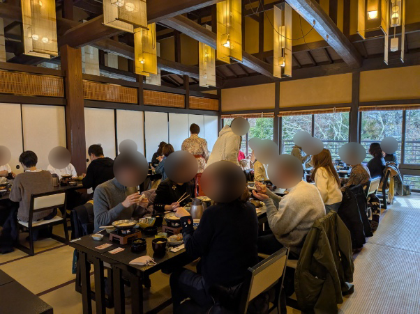 三千院目の前の料理旅館芹生にて、京都のお料理湯豆腐御膳を男女向かい合わせのお席にお座り頂き召し上がって頂きました。