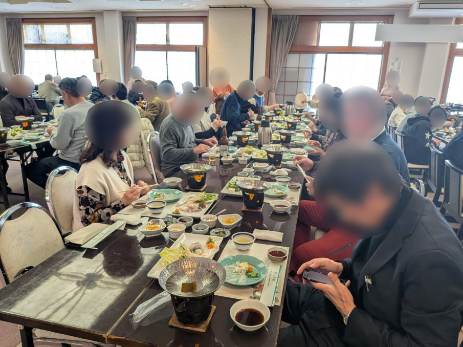 身がしまって弾力がある冬の淡路島の味覚を男女向かい合わせのお席にお座り頂き(てっちり・てっさ・ふぐの唐揚げ)などを美味しく召し上がって頂きました。
