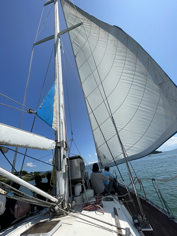 食後は牛窓にあるザ.ホテルリマーニからヨットに乗船しました。 風の力だけで走るセーリング体験をしました。