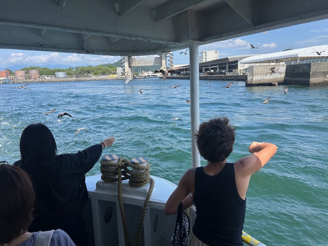 船に沢山のカモメやトンビが餌をもらいに集まってきます。
