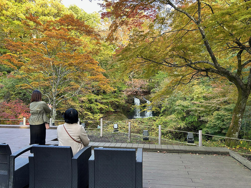 周辺にはイロハモミジが滝の美しさを引き立たせ、山梨の隠れた紅葉スポットで古民家カフェでお茶をされたグループも♪