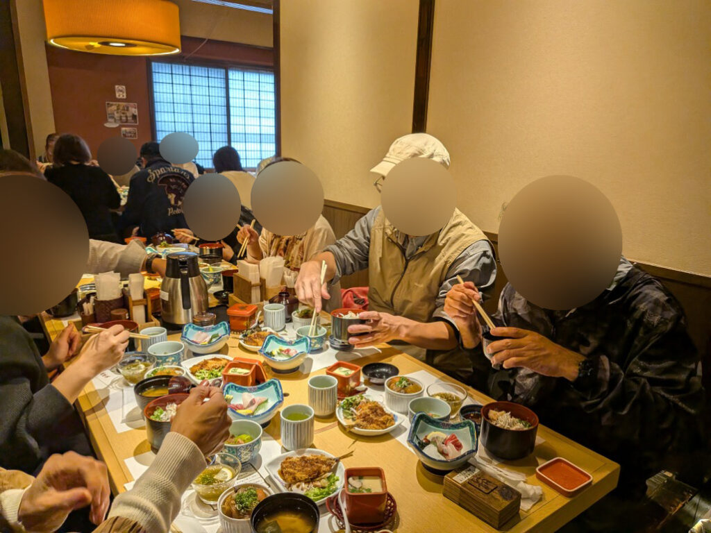 地元いけす料理店にて、お店自慢の舞鶴食べ尽くし御膳を男女向かい合わせのお席にお座り頂き召しあがって頂きました。