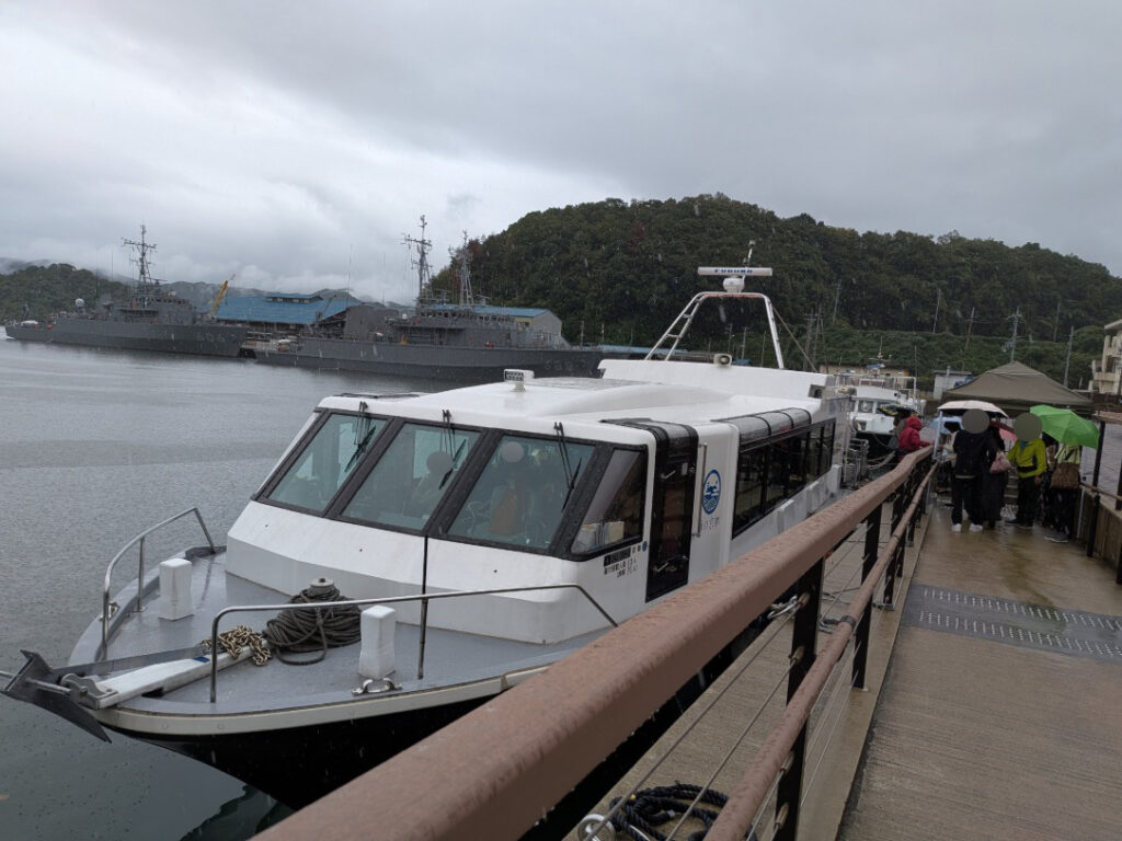 14時発の遊覧船に乗船して頂き、案内人の山中さんの説明をお聞きして頂きながら停泊する護衛船などを間近にご覧頂きました。