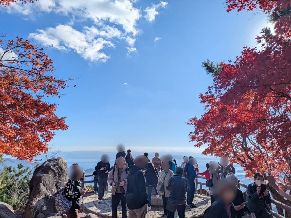 まずは、寒霞渓ロープウェイの頂上駅広場にて、散策タイム。瀬戸内の海と、寒霞渓の紅葉を、展望台等から眺めることができ、紅葉も見頃です。