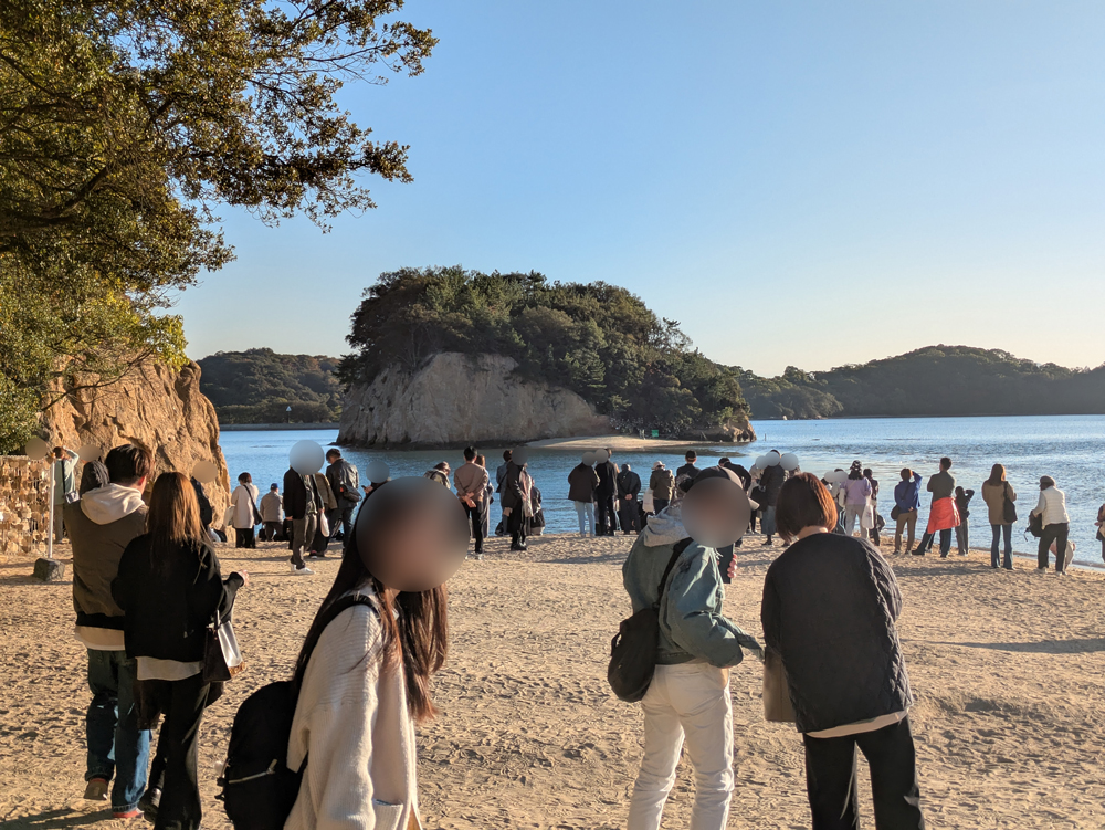 潮の満ち引きにより、干潮時には、砂の道が現れ、その道を渡ると幸せになれる…といわれているスポットへ向かいました。あいにく、干潮の時間ではなかったので、砂の道はまだ現れる少し前でしたが、砂の道の手前にある弁天島の「約束の丘展望台」から、夕日が落ちるロマンチックな景色をご覧頂きました。