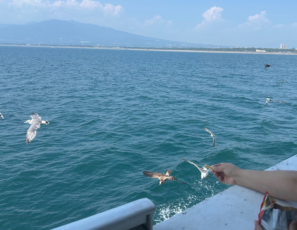 駿河湾越しに見る雄大な内浦湾内を遊覧する約30分の船旅へ海と空のパノラマを満喫しました。高低差6,000M以上!日本1高い🗻と日本1深い駿河湾を一度に見られるスポットは素晴らしい景色でした。カモメやトンビにカッパえびせんをあげる皆さん大興奮でした。