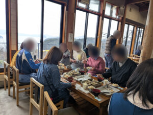 本日は男性13名様、女性13名様の合計26名様のご参加です。 まずは農園食堂andカフェへ行き、昼食をとりました。せいろ御前は野菜が盛りだくさんで、皆様も大満足なご様子でした。 食後は天気が良かったのでお庭に出て、食後のデザートとドリンクを楽しみました。