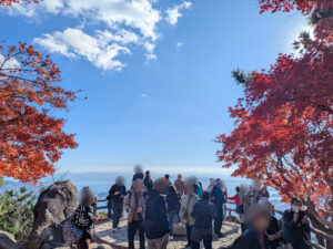 本日は、紅葉シーズン快晴の中、男性12名女性12名の計24名様が、ご参加頂きました。 本日の目的地は、小豆島、寒霞渓の紅葉と、エンジェルロード。小豆島へのフェリーに乗るため、まずは姫路港までバスを走らせ、車内のトークタイムで、和やかな雰囲気に。 フェリーに乗り、小豆島へ到着。