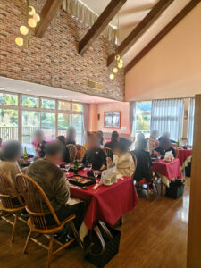 本日は男性14名、女性15名、計29名お客様にご参加頂きました! まずは砥峰高原のリゾートホテルでランチです。 こちらでは和食御膳をお召し上がり頂きました。