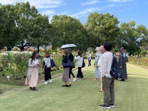 本日は男性14名様、女性14名様の合計28名様が、ハピ旅ツアーにご参加くださいました。 バスに乗車していただきトークタイムを楽しんでいただきながら岡山県に向かいました。 秋晴れ良い天気になりました。まずRSKバラ園です。 園内は秋咲きのバラが咲いていてグループで散策を楽しみました。